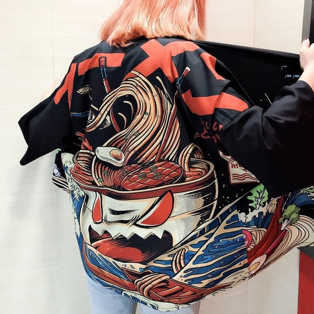 ¡Viste con sabor asiático con el Kimono Shokumotsu! Este kimono está inspirado en la icónica sopa de ramen, con un estampado divertido y colorido. ¡Haz que tu outfit sea único y sabroso con este kimono ramen!